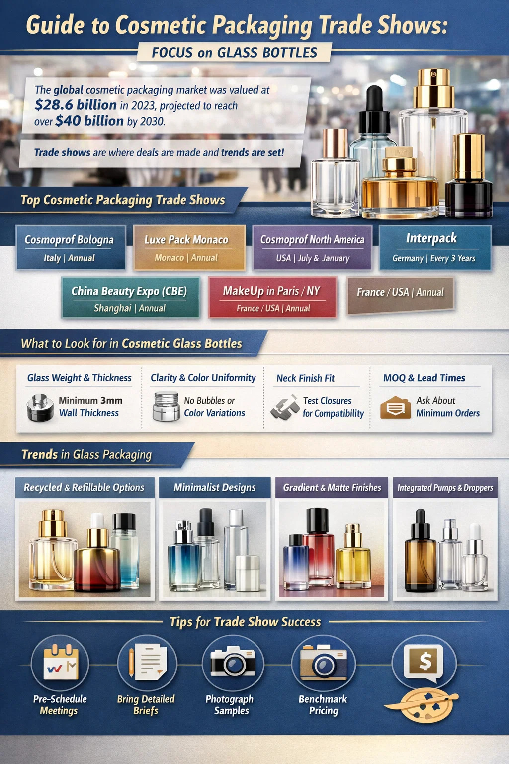Wenn Sie Verpackungen für Kosmetikprodukte beschaffen – insbesondere hochwertige Materialien wie kosmetische Glasflaschen — Der Besuch der richtigen Messen ist eine der effizientesten Entscheidungen, die Sie treffen können. An einem einzigen Ort können Sie Hunderte von Lieferanten vergleichen, physische Muster bearbeiten, Preise direkt aushandeln und Beziehungen aufbauen, deren Replikation über E-Mail-Kontakte Monate dauert. Der weltweite Markt für Kosmetikverpackungen wurde auf ca. geschätzt 28,6 Milliarden US-Dollar im Jahr 2023 und wird laut Grand View Research bis 2030 voraussichtlich über 40 Milliarden US-Dollar erreichen. Auf Messen wird ein erheblicher Teil dieses Marktes gestaltet – es werden Geschäfte gemacht, Trends gesetzt und Lieferantennetzwerke aufgebaut.