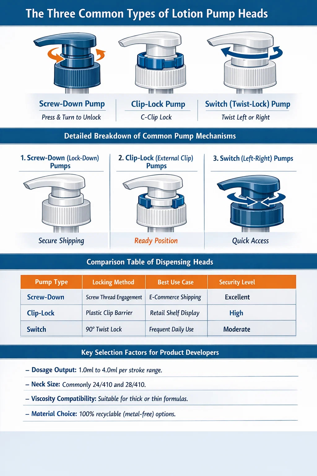 In der Verpackungsindustrie ist der Begriff Welche drei gängigen Pumpentypen gibt es? bezieht sich speziell auf die Verschluss- und Ausgabemechanismen, die zur Sicherung von Flüssigkeiten verwendet werden. Die drei häufigsten Arten sind Schraubpumpen, Clip-Lock-Pumpen und Wechseln-Pumpen (Twist-Lock). . Jedes ist so konzipiert, dass es ein Auslaufen während des Transports verhindert und gleichzeitig ein spezifisches Benutzererlebnis bei der täglichen Anwendung bietet.