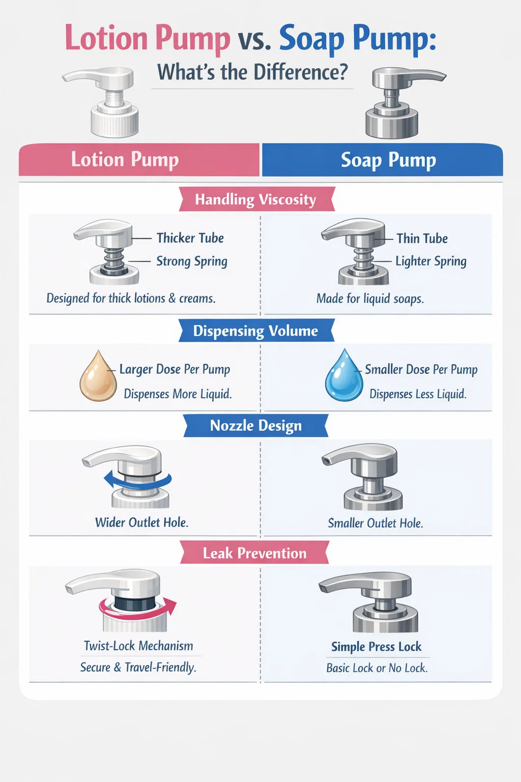 Obwohl Lotionspumpen Obwohl Seifenpumpen sehr ähnlich aussehen und häufig synonym verwendet werden, weisen sie erhebliche Unterschiede in ihrem inneren Design und ihrer Funktionalität auf.